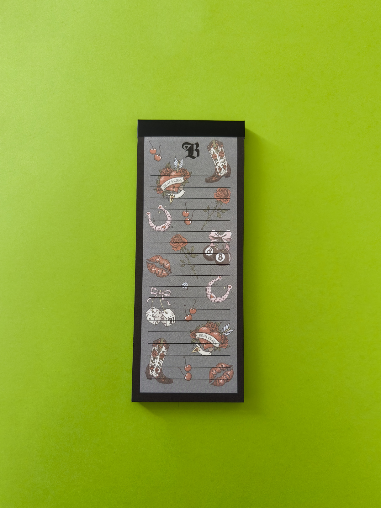 Bring a little magic to your everyday with our All Over Blessings notepad. Inspired by classic Chicana tattoo art, this design features lined notepaper with a lucky horseshoe and comes with a magnet on the back!