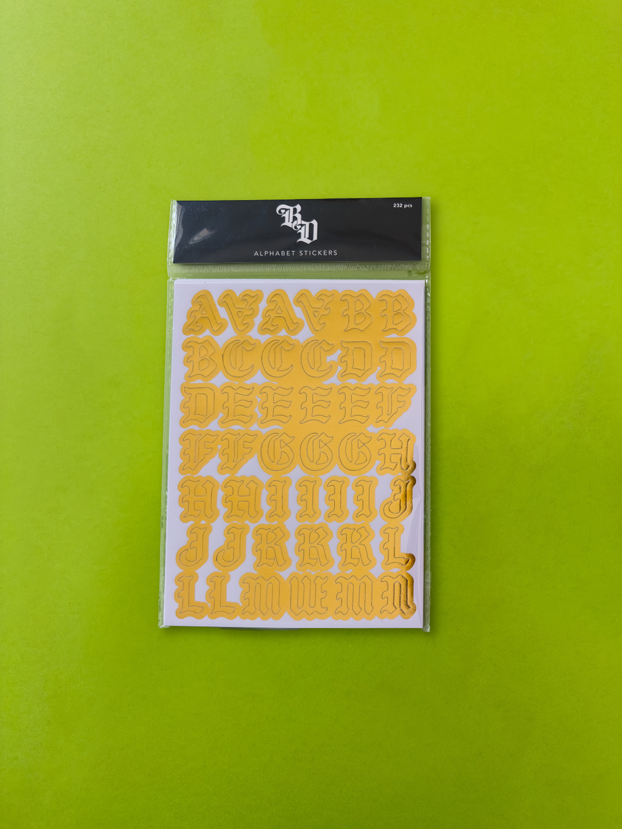 The Alphabet Sticker Pack features 8 pages of gold foil Old English font stickers—complete with numbers, symbols, and both uppercase and lowercase letters. Perfect for customizing notebooks, laptops, planners, and all your homegirl essentials. Bold, shiny, and ready to elevate anything you stick ’em on!