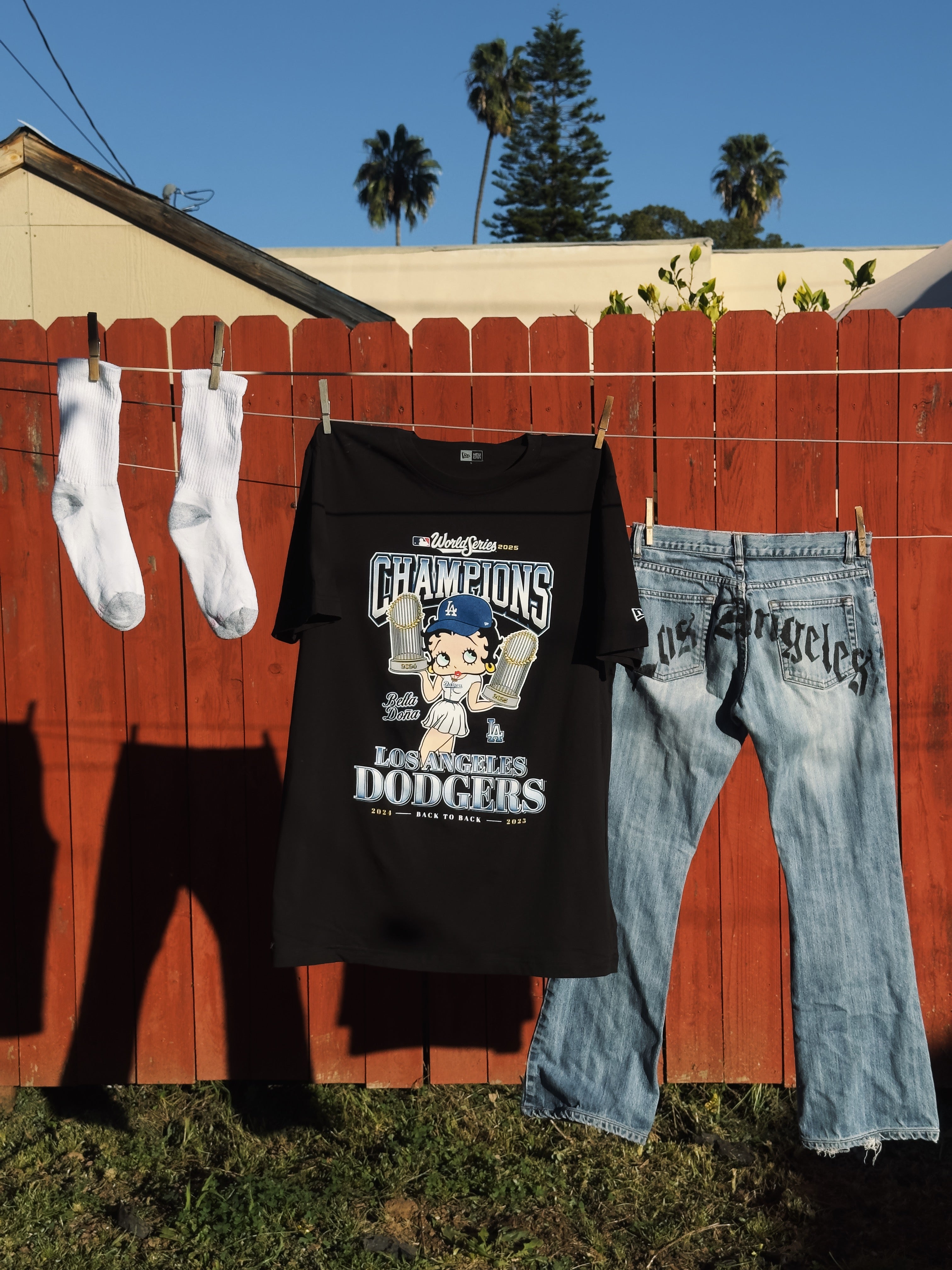 Back-to-back and forever legendary! The Bella Doña x Betty Boop x Los Angeles Dodgers 2025 World Series Champions Black Tee features a statement graphic of Betty Boop carrying two trophies, celebrating the Dodgers’ historic 2024–2025 championship run. A true LA and Betty Boop collector’s piece.