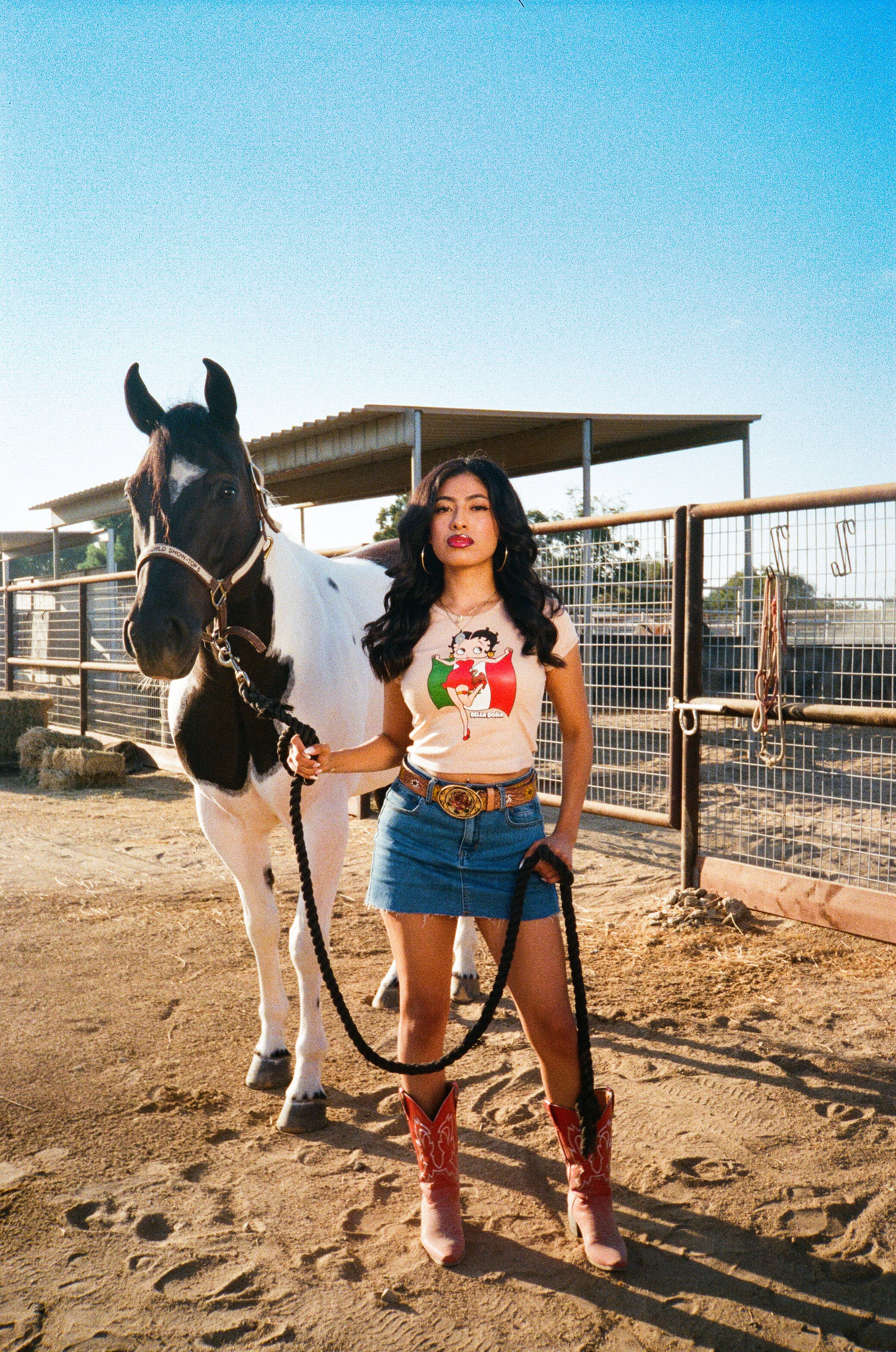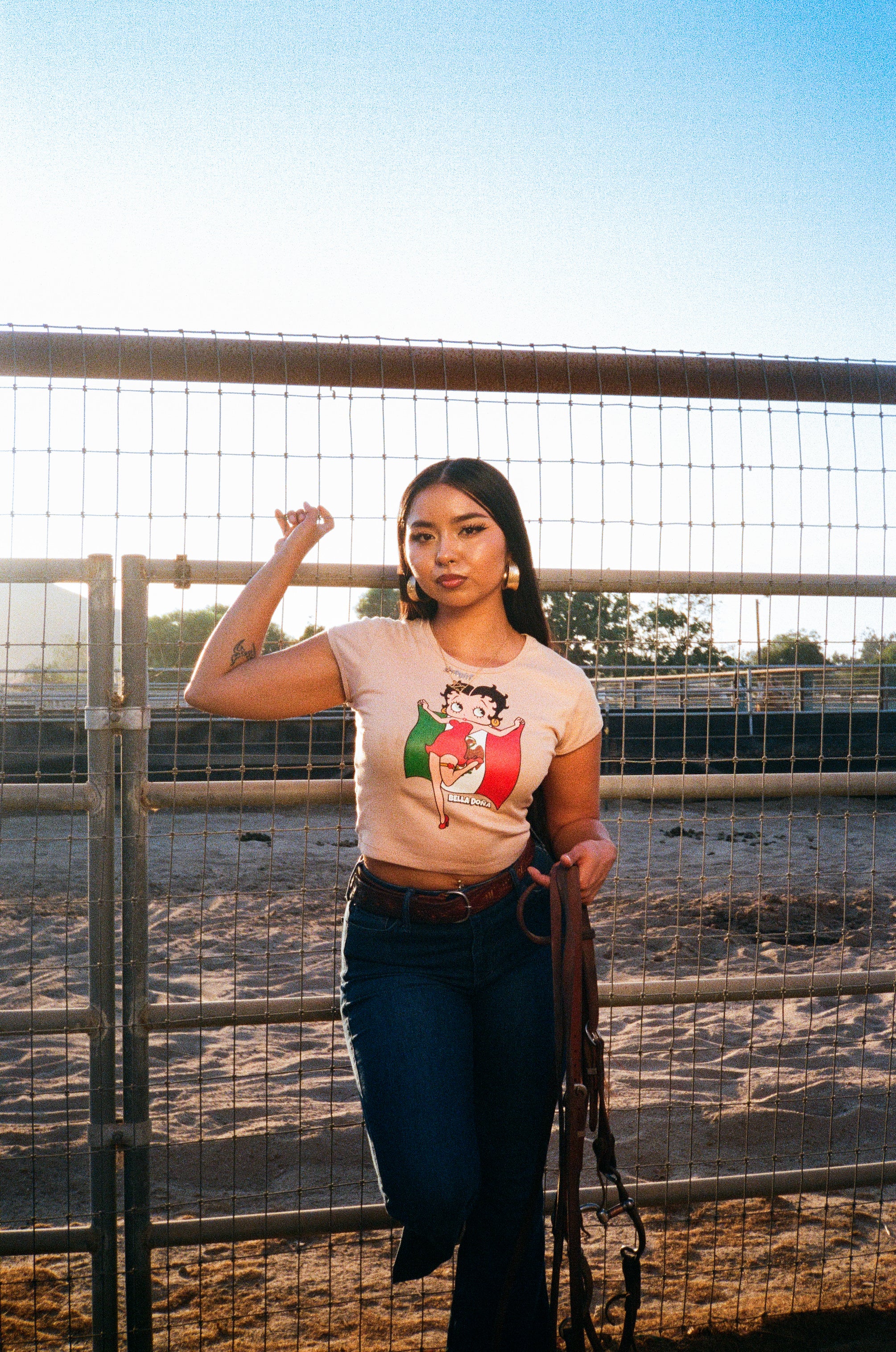 We wanted to do something beyond imaginable to celebrate our culture & pride this month with a one of a kind Betty Boop Baby Tee! Dressed in her signature red dress, Betty Boop confidently holds up the Mexican Bandera!