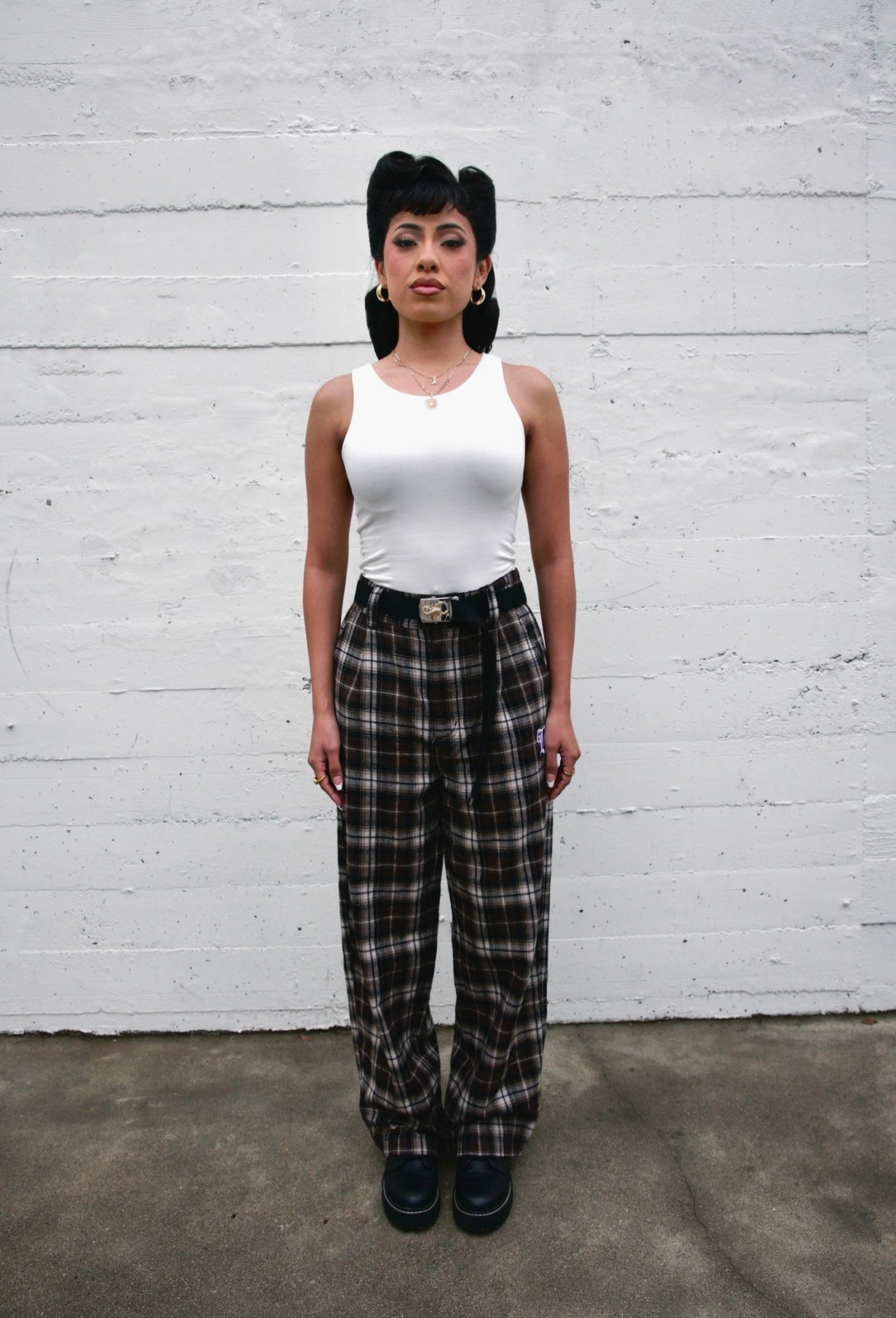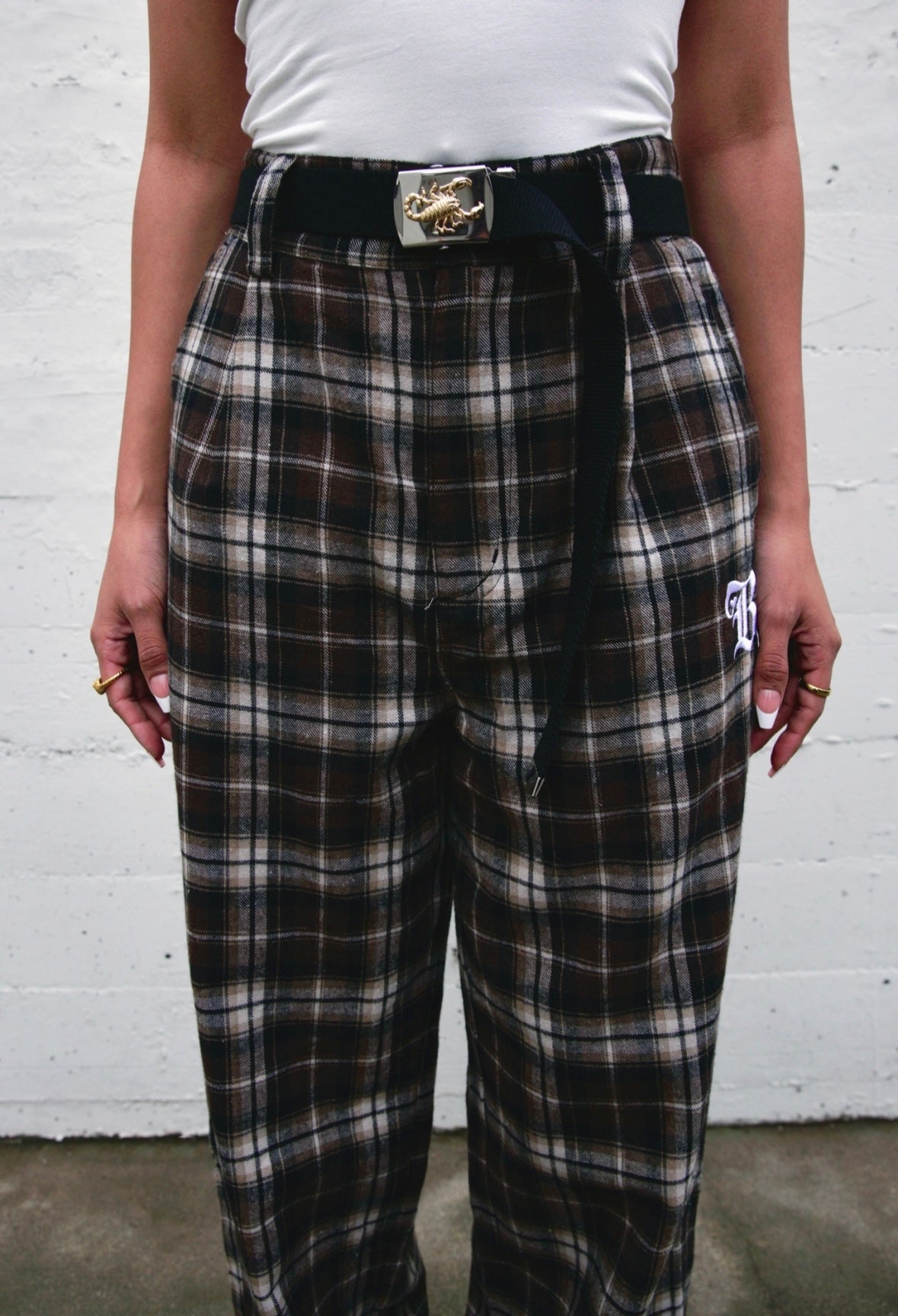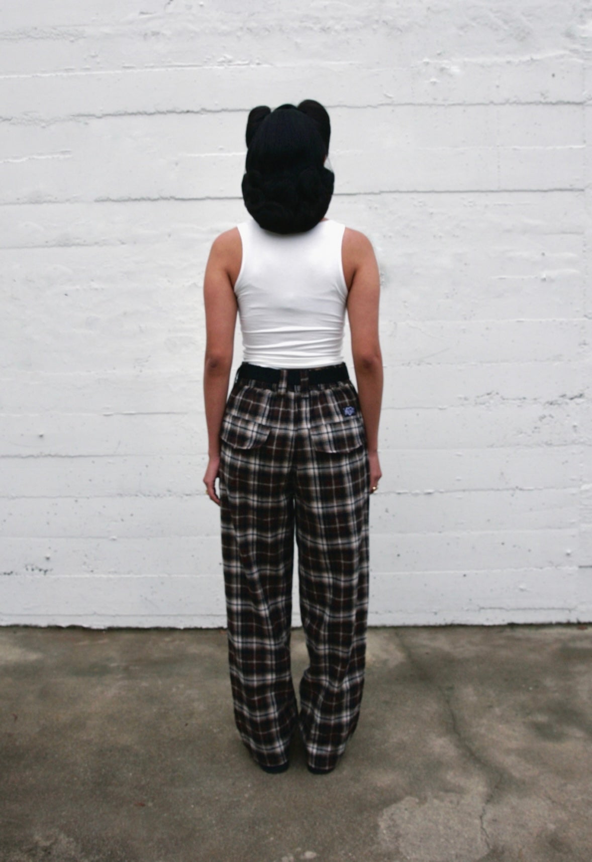 Complete your fit with the comfiest lightweight flannel plaid flare pants! Designed with deep front pockets, an elastic waistband, and lil back pockets with button snaps to keep it cute 'n functional. Create a vintage-styled look with a fitted turtle neck or dress it down with a cropped graphic tee, and you're out the door, homegirl!