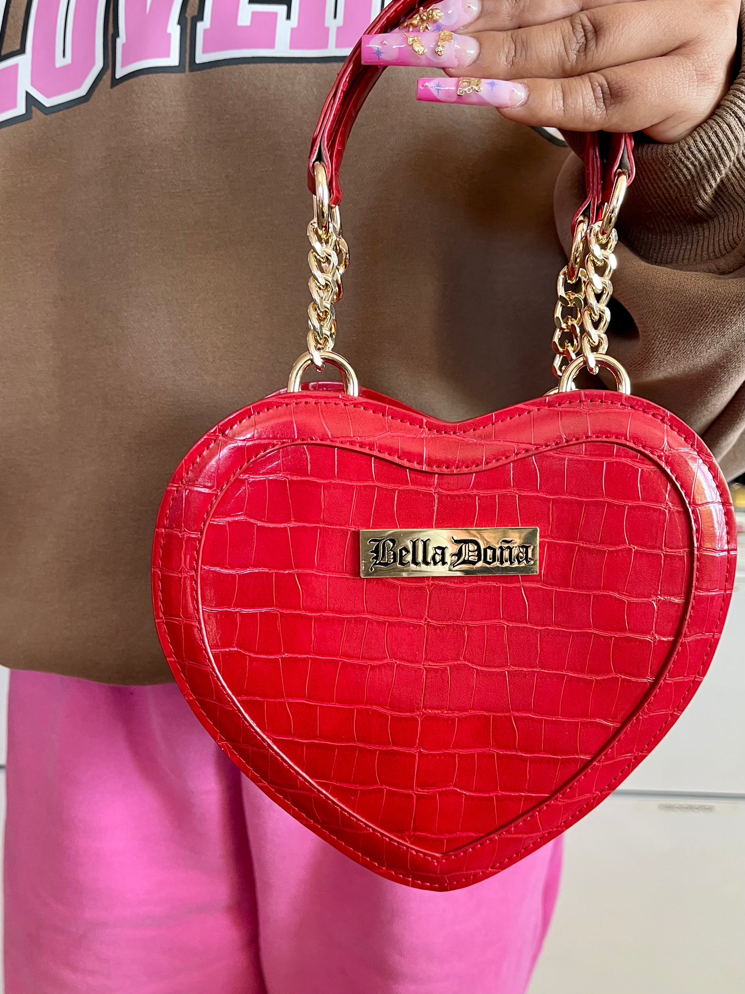 Our custom red MINI heart shaped handbag is the PERF size to hold all your essentials! Grab your cards, cash, some gloss & you're good to go BBgirl!