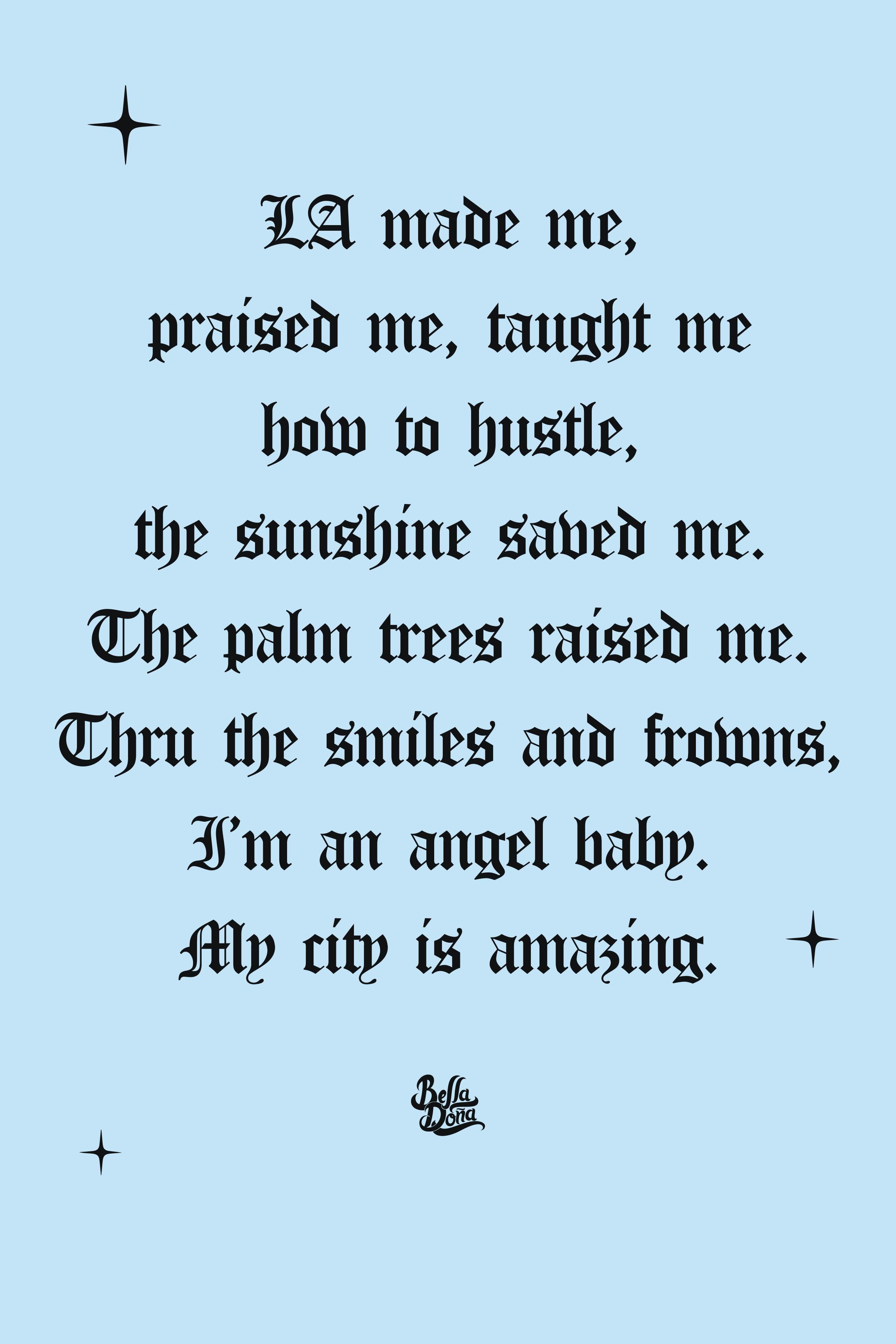 Show the City of Angels some love with our latest L.A. Made Me Poster! This poem sits on a sky blue background and is quintessential decor for all Angel Bbs!! Decorate your dorm, office, work space, bedroom or anywhere you wanna rep the place we call home!