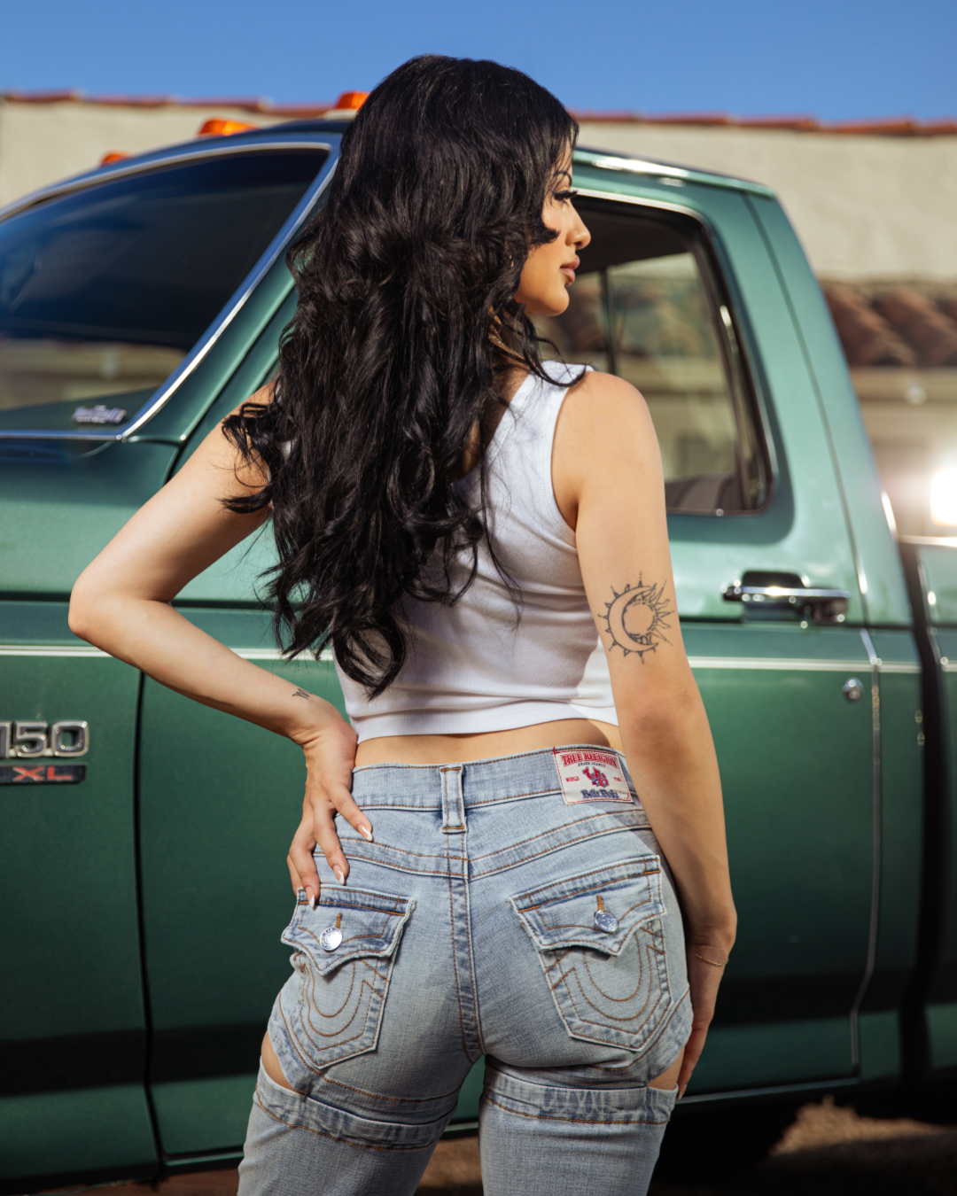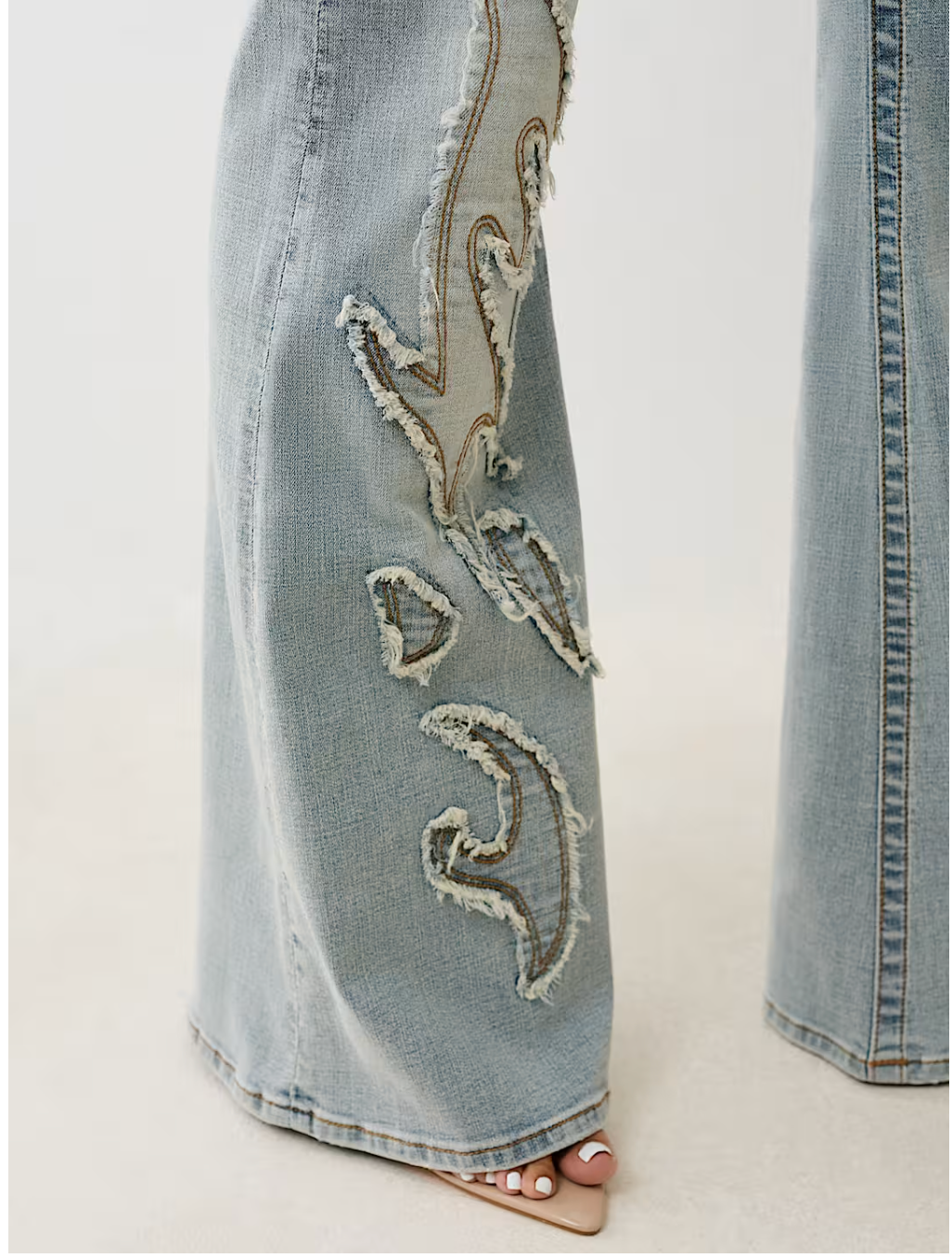 Be the ultimate smokeshow in the True Religion x Bella Doña Mid Rise Cut-Out Flare Jean. Crafted in a light wash, these mid-rise jeans feature thigh-baring cut-outs, denim flame appliqués, and a flared hem designed to show off your curves!